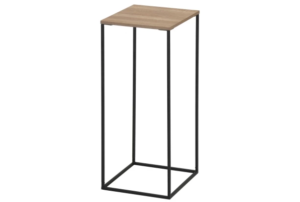 Stojan o výšce 70 cm na černé kovové konstrukci v kombinaci s dubovým dřevodekorem. Snadno využitelný nejen v obýváku například pro umístění kytky, stolní lapičky nebo jakýchkoliv dekorací.