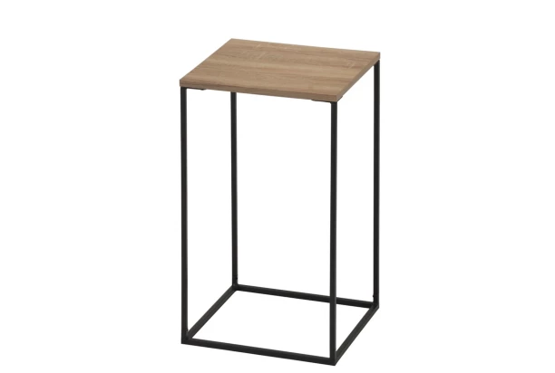 Stojan/stolek o výšce 50 cm na černé kovové konstrukci v kombinaci s dubovým dřevodekorem. Snadno využitelný nejen v obýváku pro odkládání kávy, ale i například pro umístění kytky, stolní lapičky nebo jakýchkoliv dekorací.