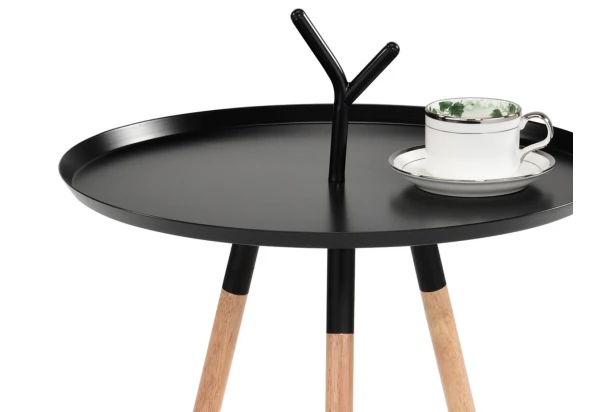 Kulatý odkládací stolek na dřevěných nožkách v kombinaci s černým kovem skvěle doplní stylový interier. Stolek vynikne u pohovky, kde poslouží pro praktické odkládání věcí, případně kdekoliv v rohu místnosti jako místo pro umístění lampičky, vázy s kytkami anebo umístění dekorací.