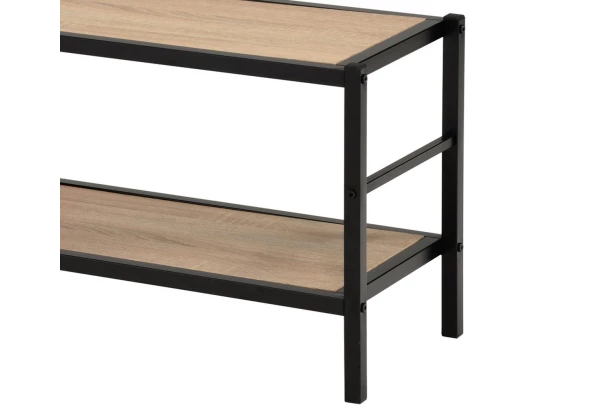 Černý kovový regál se 2 policemi v dubovém dekoru je univerzální do obýváku, pracovny, dětského pokoje, předsíně i šatny. Může posloužit i jako botník.