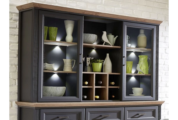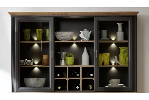 Nástavná vitrína s přihrádkami a osvětlením v provedení grafit s dubovým dřevodekorem z kolekce Jasmin – nábytek v moderním venkovském stylu s důrazem na detail navazuje na tradici útulně zařízeného domova a přímo láká k tomu, abyste si vytvořili prostředí, kde se budete cítit dobře. Kombinujte tak jednotlivé elementy z této řady a vytvořte si stylový rustikální interier s nádechem tradice.