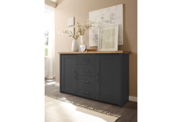 Široká komoda se šuplíky uprostřed z kolekce Locarno – elegantní venkovský styl podtrhují dekorativní reliéfy předních ploch a kombinace grafitové barvy s útulnými tóny dřevodekoru dub artisan. Skříňka o šířce 150 cm nabízí kombinaci zásuvek i dveří pro přehledné ukládání.