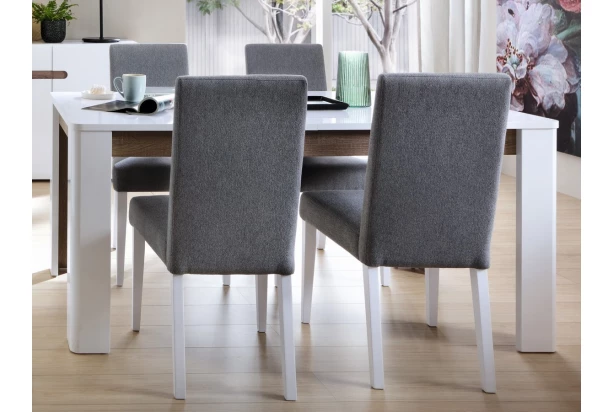 Rozkládací jídelní stůl z programu Linate – stylový nábytek se zaoblenými liniemi působí velmi elegantně. Dřevodekor dub Truffel vytváří s lesklými a matnými bílými plochami příjemný kontrast a dokonale se hodí do moderně zařízeného bytu.