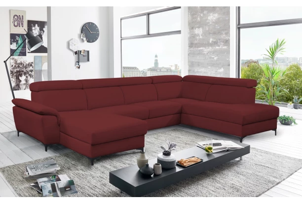 Prostorná sedací souprava ve tvaru U uspokojí všechny, kdo mají rádi moderní styl, vysokou míru pohodlí a zároveň ocení praktičnost spolu se solidním zpracováním. Očalouněna jemně strukturovanou látkou v odstínu tmavě červená. Pohodlné sezení doplňují polohovatelné opěrky hlavy, funkce rozkladu i praktické úložné prostory pod oběma otomany. Varianta sedačky s polohovatelnou područkou na levé straně.
