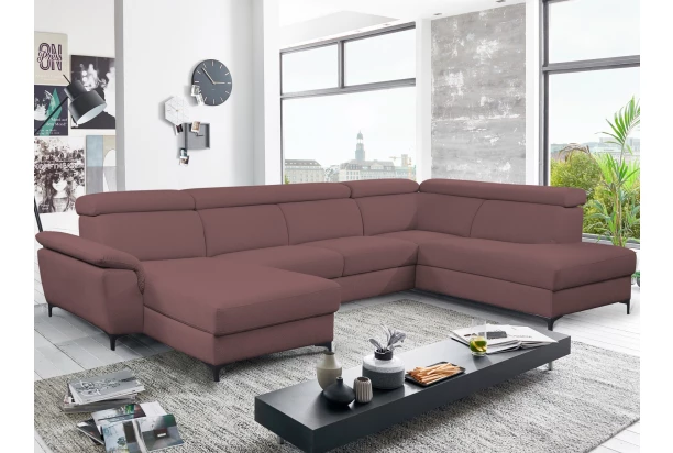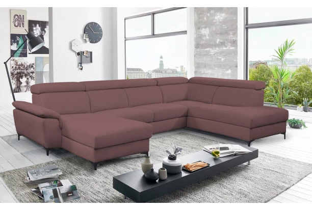 Prostorná sedací souprava ve tvaru U uspokojí všechny, kdo mají rádi moderní styl, vysokou míru pohodlí a zároveň ocení praktičnost spolu se solidním zpracováním. Očalouněna jemně strukturovanou látkou v odstínu starorůžová. Pohodlné sezení doplňují polohovatelné opěrky hlavy, funkce rozkladu i praktické úložné prostory pod oběma otomany. Varianta sedačky s polohovatelnou područkou na levé straně.