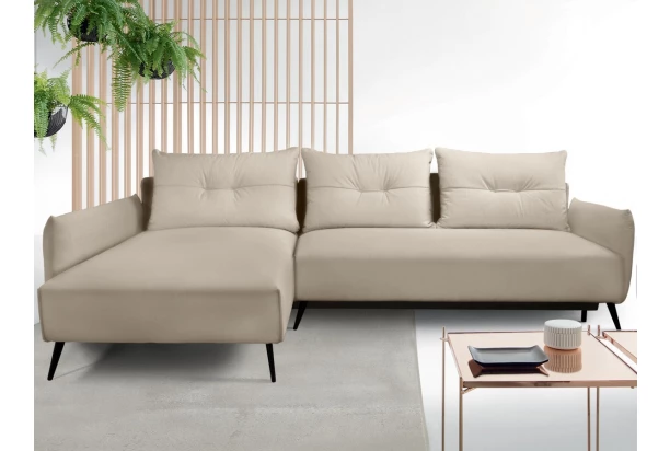 Dopřejte si každodenní příjemné pohodlí a buďte jednoduše trendy. Pohodlná rohová sedací souprava na černých kovových nohách působí elegantně a vzdušně v každém prostoru obýváku. Očalouněna měkkou látkou v odstínu světle béžová. Polštářová optika bočních područek šetří okolní místo a sedačka tak snadno rozměrově pasuje do mnoha interierů. Rohová sedačka s otomanem vytváří levý roh.