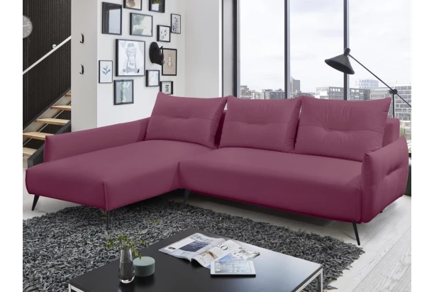 Dopřejte si každodenní příjemné pohodlí a buďte jednoduše trendy. Pohodlná rohová sedací souprava na černých kovových nohách působí elegantně a vzdušně v každém prostoru obýváku. Očalouněna měkkou látkou v odstínu fialová lila. Polštářová optika bočních područek šetří okolní místo a sedačka tak snadno rozměrově pasuje do mnoha interierů. Rohová sedačka s otomanem vytváří levý roh.