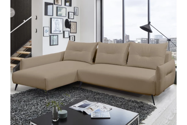 Dopřejte si každodenní příjemné pohodlí a buďte jednoduše trendy. Pohodlná rohová sedací souprava na černých kovových nohách působí elegantně a vzdušně v každém prostoru obýváku. Očalouněna měkkou látkou v odstínu světle hnědá. Polštářová optika bočních područek šetří okolní místo a sedačka tak snadno rozměrově pasuje do mnoha interierů. Rohová sedačka s otomanem vytváří levý roh.