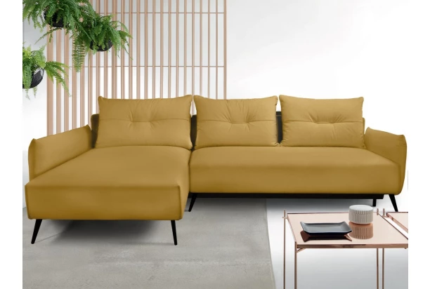 Dopřejte si každodenní příjemné pohodlí a buďte jednoduše trendy. Pohodlná rohová sedací souprava na černých kovových nohách působí elegantně a vzdušně v každém prostoru obýváku. Očalouněna měkkou látkou v odstínu hořčicová žlutá. Polštářová optika bočních područek šetří okolní místo a sedačka tak snadno rozměrově pasuje do mnoha interierů. Rohová sedačka s otomanem vytváří levý roh.