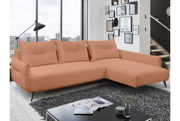 Dopřejte si každodenní příjemné pohodlí a buďte jednoduše trendy. Pohodlná rohová sedací souprava na černých kovových nohách působí elegantně a vzdušně v každém prostoru obýváku. Očalouněna měkkou látkou v odstínu lososová. Polštářová optika bočních područek šetří okolní místo a sedačka tak snadno rozměrově pasuje do mnoha interierů. Rohová sedačka s otomanem vytváří pravý roh.