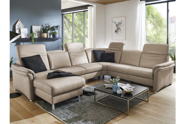 Luxusní sedací souprava ve tvaru U nabízí prostor pro celou rodinu i kvalitní zpracování. Stabilní dřevěnou konstrukci doplňuje jádro z kombinace pružin a studené pěny, která zajišťuje komfortně měkké sezení. Sedačka je očalouněna imitací kůže v odstínu béžová. Svým elegantním stylem se sedačka hodí jak do moderního, tak do klasicky zařízeného obýváku. Sedací souprava je vybavena polohovatelnými opěrkami hlavy, relaxační funkcí s polohováním opěráku v rohovém dílu sedačky, funkcí rozkladu na příležitostné lůžko a sedákem s elektrickou funkcí polohování, který lze snadno proměnit v relaxační lehátko pro chvíle pohody. Další vychytávkou je funkce sklápěcího opěradla, díky němuž získáte uprostřed praktický odkládací stolek včetně rafinovaně ukryté elektrické zásuvky – snadno si tak připojíte laptop, smartphone nebo další příslušenství.