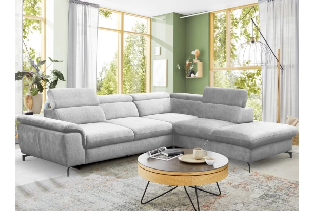 Moderní design a skvělý komfort, který si sami kdykoliv přizpůsobíte podle sebe díky polohovatelným funkcím – rohová sedací souprava na černých kovových nohách je vybavena funkcí nastavení hloubky sedáku i funkcí polohování zádových opěrek. Očalouněna jemně strukturovanou látkou v barvě světle šedá. Pravý otoman rohové sedačky ukrývá praktický úložný prostor. Oceníte i funkci rozkladu na lůžko pro příležitostné spaní.