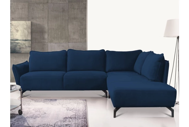 Atraktivní rohová sedací souprava je inspirována módními trendy. Elegantní design zaoblených tvarů, polštářová optika i kvalitní zpracování. Sedačka s bočním otomanem vytváří pravý roh a nabízí dostatek prostoru pro vaši každodenní pohodu. Užívejte si tak komfortně laděné sezení, které navíc zpříjemňuje měkká velurová sametová látka v odstínu námořnická modrá. Černé kovové nohy poskytují sedačce stabilní základ a navíc dodávají obývacímu prostoru pocit vzdušnosti.