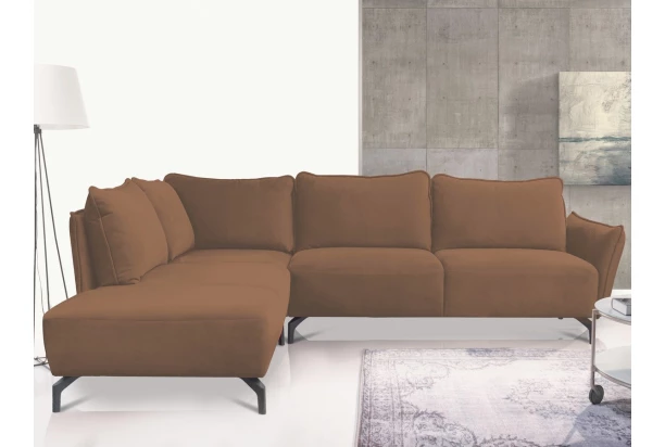 Atraktivní rohová sedací souprava je inspirována módními trendy. Elegantní design zaoblených tvarů, polštářová optika i kvalitní zpracování. Sedačka s bočním otomanem vytváří levý roh a nabízí dostatek prostoru pro vaši každodenní pohodu. Užívejte si tak komfortně laděné sezení, které navíc zpříjemňuje měkká velurová sametová látka v odstínu hnědá whiskey. Černé kovové nohy poskytují sedačce stabilní základ a navíc dodávají obývacímu prostoru pocit vzdušnosti.