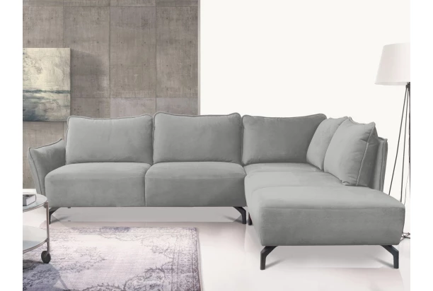 Atraktivní rohová sedací souprava je inspirována módními trendy. Elegantní design zaoblených tvarů, polštářová optika i kvalitní zpracování. Sedačka s bočním otomanem vytváří pravý roh a nabízí dostatek prostoru pro vaši každodenní pohodu. Užívejte si tak komfortně laděné sezení, které navíc zpříjemňuje měkká velurová sametová látka v odstínu světle šedá. Černé kovové nohy poskytují sedačce stabilní základ a navíc dodávají obývacímu prostoru pocit vzdušnosti.