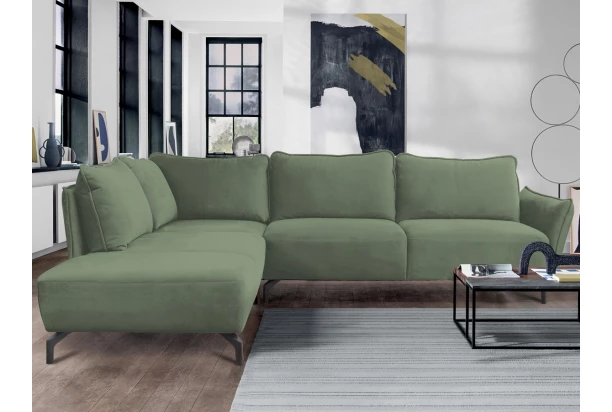 Atraktivní rohová sedací souprava je inspirována módními trendy. Elegantní design zaoblených tvarů, polštářová optika i kvalitní zpracování. Sedačka s bočním otomanem vytváří levý roh a nabízí dostatek prostoru pro vaši každodenní pohodu. Užívejte si tak komfortně laděné sezení, které navíc zpříjemňuje měkká velurová sametová látka v odstínu olivově zelená. Černé kovové nohy poskytují sedačce stabilní základ a navíc dodávají obývacímu prostoru pocit vzdušnosti.