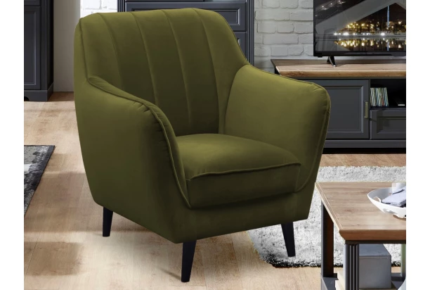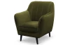Elegantní křeslo na masivních dřevěných nohách poskytuje výtečný komfort díky kvalitnímu vypolstrování. Očalouněno sametově měkkou látkou v barvě mechová zelená. Zaoblené tvary doplňuje látkové lemování a svislé prošití. Svým univerzálním designem se křeslo hodí do různě zařízených interierů – od skandinávského stylu, přes retro, noblesní klasiku, až po styl domáckého venkova.