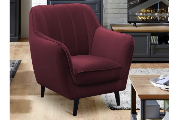 Elegantní křeslo na masivních dřevěných nohách poskytuje výtečný komfort díky kvalitnímu vypolstrování. Očalouněno sametově měkkou látkou v barvě vínová. Zaoblené tvary doplňuje látkové lemování a svislé prošití. Svým univerzálním designem se křeslo hodí do různě zařízených interierů – od skandinávského stylu, přes retro, noblesní klasiku, až po styl domáckého venkova.