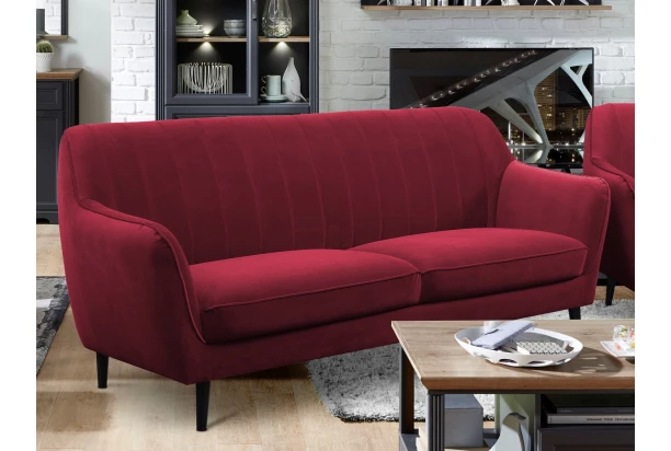 Elegantní trojmístná pohovka na masivních dřevěných nohách poskytuje výtečný komfort díky kvalitnímu vypolstrování. Očalouněna sametově měkkou látkou v barvě červená. Zaoblené tvary doplňuje látkové lemování a svislé prošití. Svým univerzálním designem se pohovka hodí do různě zařízených interierů – od skandinávského stylu, přes retro, noblesní klasiku, až po styl domáckého venkova.