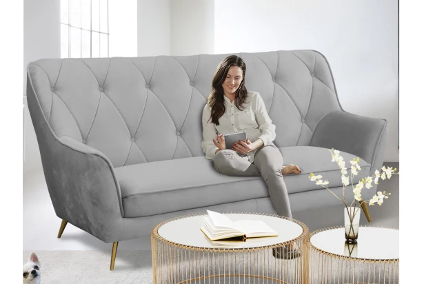 Trojmístná pohovka s prošitím a knoflíky vnese do interieru nádech luxusu a elegance. Očalouněna sametově hebkou látkou v odstínu světle šedá. Oceníte především velmi komfortní sezení s vysokým opěradlem, které poskytne příjemnou oporu pro vaše záda i hlavu. Kovové nohy ve zlaté barvě působí vzdušně a dotváří noblesní pocit.