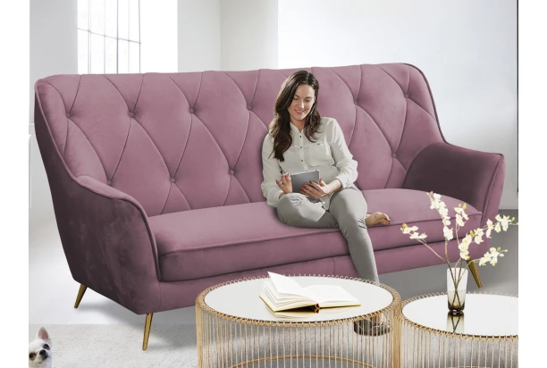 Trojmístná pohovka s prošitím a knoflíky vnese do interieru nádech luxusu a elegance. Očalouněna sametově hebkou látkou v odstínu starorůžová. Oceníte především velmi komfortní sezení s vysokým opěradlem, které poskytne příjemnou oporu pro vaše záda i hlavu. Kovové nohy ve zlaté barvě působí vzdušně a dotváří noblesní pocit.