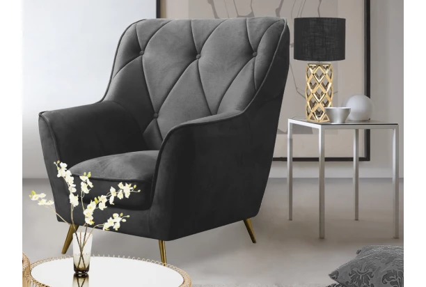 Křeslo s prošitím a knoflíky vnese do interieru nádech luxusu a elegance. Očalouněno sametově hebkou látkou v odstínu antracitová. Oceníte především velmi komfortní sezení s vysokým opěradlem, které poskytne příjemnou oporu pro vaše záda i hlavu. Kovové nohy ve zlaté barvě působí vzdušně a dotváří noblesní pocit.