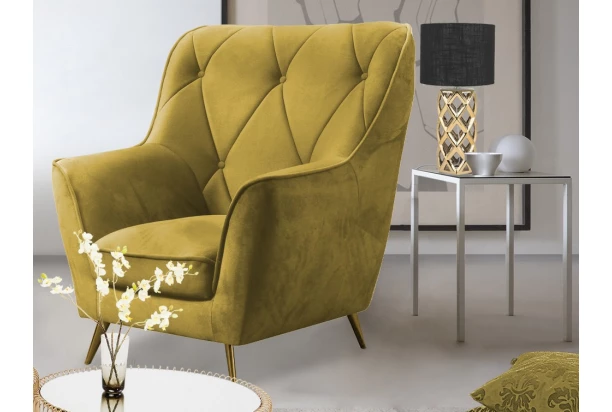Křeslo s prošitím a knoflíky vnese do interieru nádech luxusu a elegance. Očalouněno sametově hebkou látkou v odstínu hořčicová žlutá. Oceníte především velmi komfortní sezení s vysokým opěradlem, které poskytne příjemnou oporu pro vaše záda i hlavu. Kovové nohy ve zlaté barvě působí vzdušně a dotváří noblesní pocit.
