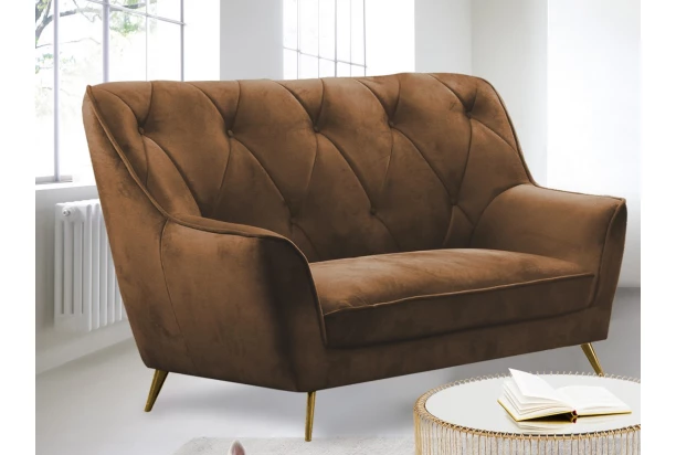 Dvoumístní pohovka s prošitím a knoflíky vnese do interieru nádech luxusu a elegance. Očalouněna sametově hebkou látkou v odstínu hnědá whiskey. Oceníte především velmi komfortní sezení s vysokým opěradlem, které poskytne příjemnou oporu pro vaše záda i hlavu. Kovové nohy ve zlaté barvě působí vzdušně a dotváří noblesní pocit.