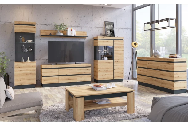 TV skříňka z programu Corte – moderní minimalistický styl s rovnými šedými liniemi dává vyniknout přirozeným tónům dubového dřevodekoru. Můžete si tak zařídit byt moderně a zároveň si zachovat útulnou atmosféru, kde se cítíte prostě doma.