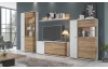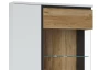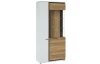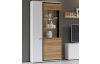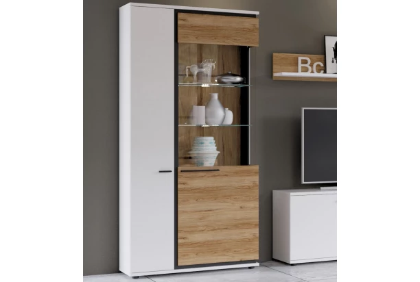 Vysoká vitrína z programu Salinas – originálně řešený nábytek v trojkombinaci bílá, černá a dubový dřevodekor vytváří zajímavou kompozici, která vypadá jako skládačka z kostek. Zaujme na pohled v každém moderním bytě.