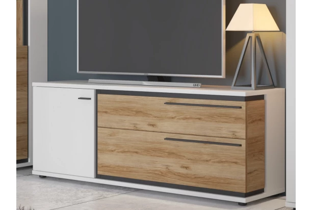 TV skříňka z programu Salinas – originálně řešený nábytek v trojkombinaci bílá, černá a dubový dřevodekor vytváří zajímavou kompozici, která vypadá jako skládačka z kostek. Zaujme na pohled v každém moderním bytě.