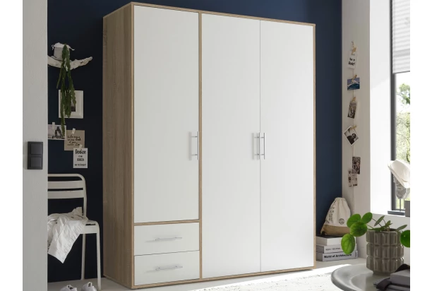 Klasická šatní skříň o šířce 155 cm v provedení dub sonoma/bílá. Praktické větší úchyty dobře padnou do ruky při otevírání 3 otočných dveří nebo 2 zásuvek. Uvnitř skříně najdete i šatní tyč i police.