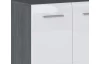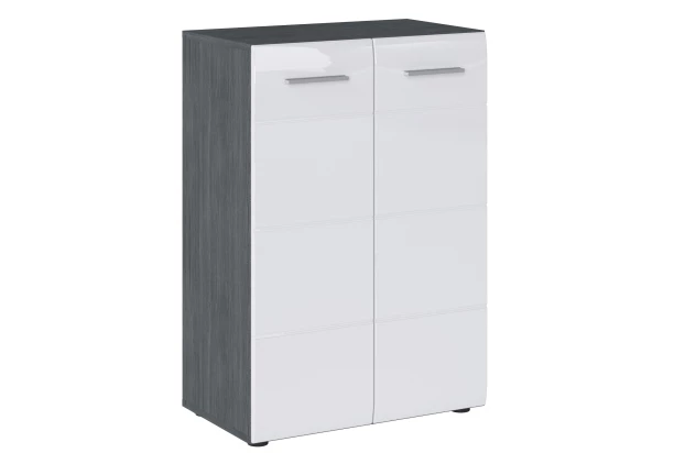 Moderní skříňka v kombinaci kouřově šedý dub/bílá lesk má zaoblené hrany předních ploch a decentní horizontální frézování. Díky jednoduše elegantnímu stylu se hodí do jakéhokoliv interieru.