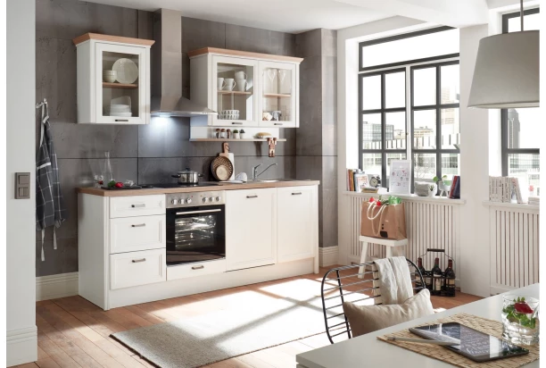 Kuchyňská linka v provedení bělená pinie s dubovým dřevodekorem z kolekce Jasmin – kuchyně v moderním venkovském stylu s důrazem na detail navazuje na tradici útulně zařízeného domova a přímo láká k tomu, abyste si vytvořili prostředí, kde se budete cítit dobře. Kombinujte tak jednotlivé elementy z této řady a vytvořte si stylový rustikální interier s nádechem tradice.