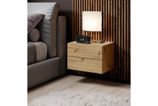 Nástěnný noční stolek se 2 zásuvkami v dekoru dub artisan působí moderně a vzdušně. Navíc díky zavěšení na stěnu umožňuje snadný uklid v prostoru ložnice.