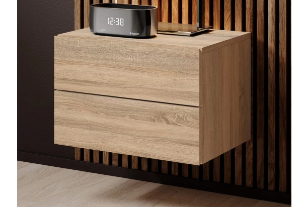 Nástěnný noční stolek se 2 zásuvkami v dekoru dub sonoma působí moderně a vzdušně. Navíc díky zavěšení na stěnu umožňuje snadný uklid v prostoru ložnice.