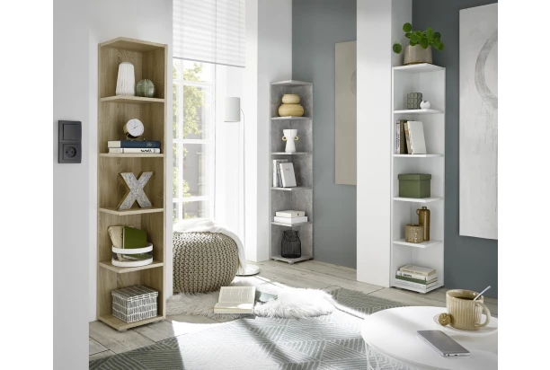 Rohový regál v dekoru dub sonoma s 5 přihrádkami poslouží pro ukládání jakýchkoliv drobných předmětů nebo dekorací. Díky svým rozměrům najde své místo téměř v každém koutě místnosti.