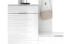 Bílá předsíňová stěna v moderním provedení s lesklými předními plochami je doplněna zajímavými liniemi ve vodorovném směru. Sestava obsahuje nízký botník, úložnou skříňku, šatní panel i zrcadlo. Jednotlivé díly mohou tvořit kompaktní celek anebo je můžete umístit samostatně.