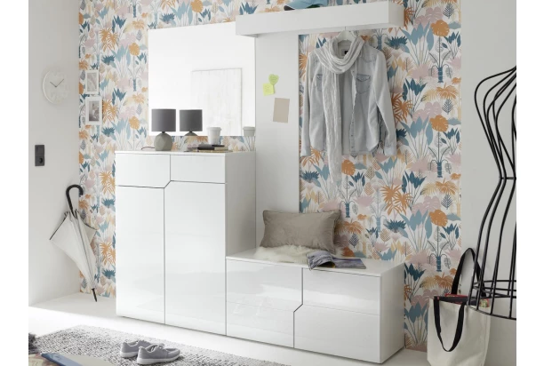 Lesklá bílá předsíňová stěna Push obsahuje botník, úložnou lavici, zrcadlo a šatní panel. Minimalistický design nábytku ozvláštňují zkosené tvary předních ploch, které vytváří zajímavou optiku. Jednotlivé díly mohou tvořit celek anebo je lze rozmístit samostatně podle potřeby.
