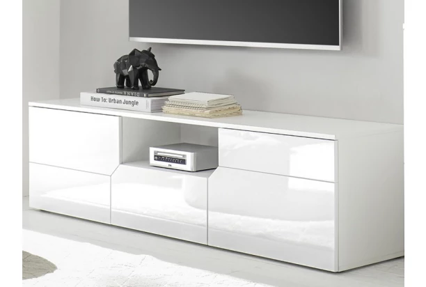 Lesklá bílá televizní skříňka o šířce 160 cm z programu Push. Minimalistický design nábytku ozvláštňují zkosené tvary předních ploch, které vytváří zajímavou optiku.