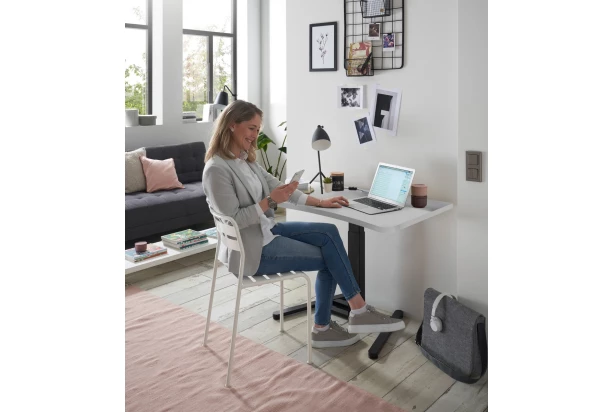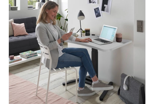 Moderní psací stůl ve světle šedém provedení je vybaven výškově nastavitelným mechanismem, který Vám zpříjemní práci – pomocí zabudovaného panelu s tlačítky si můžete pracovní plochu stolu kdykoliv snadno a rychle přizpůsobit aktuální potřebě. Můžete tak pracovat střídavě vsedě i vestoje, což ocení hlavně Vaše záda. Díky paměťové funkci si můžete uložit polohy stolu, které vám vyhovují.