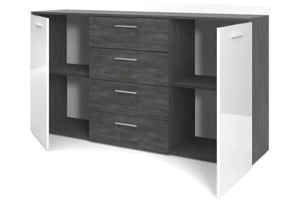 Komoda o šířce 160 cm nabízí úložné prostory za otočnými dveřmi a ve čtyřech středových zásuvkách. V kombinaci tmavého dekoru dřeva s bílými lesklými plochami.