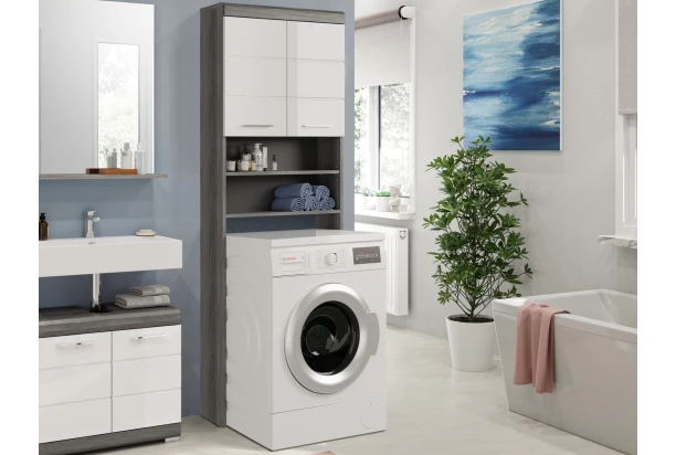 Úložná skříňka nad pračku z programu Scout – moderní, elegantní a zároveň praktický nábytek v kombinaci šedý kouřový dub s leskle bílými plochami. Přední plochy se zkosenou hranou a decentně frézovanými liniemi jsou příjemným detailem. Skříňka obsahuje odkládací přihrádky a 2 otočné dveře, za kterými najdete úložné prostory pro přehledné ukládání. Do otevřené spodní části můžete umístit pračku, sušičku nebo třeba prádelní koš. Tato zvýšená skříňka prakticky poslouží nejen v prostoru koupelny, ale i prádelně anebo šatně.