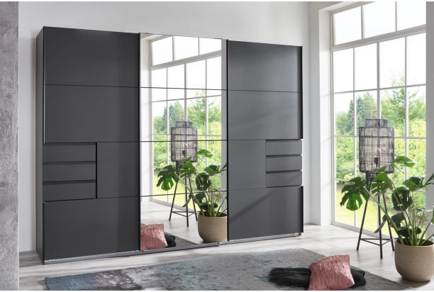 Šatní skříň se zrcadlem z ložnicové kolekce Saigon – nadčasový design nábytku v provedení tmavě šedý grafit se dokonale hodí do moderně zařízené ložnice. Skříň o šířce 270 cm má 3 snadno posuvné dveře se středovým zrcadlem, 6 bočních zásuvek a prakticky členěné vnitřní prostory s policemi a šatními tyčemi.