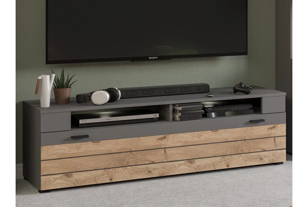 TV stolek z kolekce Freno – moderní šedý nábytek doplňují profilované povrchy v dubovém dřevodekoru, které vytváří na předních plochách zajímavý lamelový efekt. Nábytek je tak na pohled zajímavý a zároveň působí útulně v interieru.