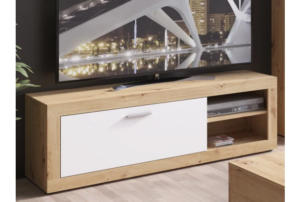 TV skříňka z kolekce Brilon – nábytek v moderním nadčasovém stylu působí elegantně a zároveň prakticky poslouží během každého dne. Přímočaré linie v kombinaci dekoru dub artisan/bílá navíc zvýrazňuje oblíbená optika širokých předních rámů. Televizní stolek o šířce 150 cm nabízí kombinaci otevřených přihrádek pro uložení elektroniky a také vnitřní prostory, kam snadno uschováte například věci každodenní potřeby. Tato skříňka pod televizi tak bude praktickou a zároveň estetickou součástí moderního bytu.