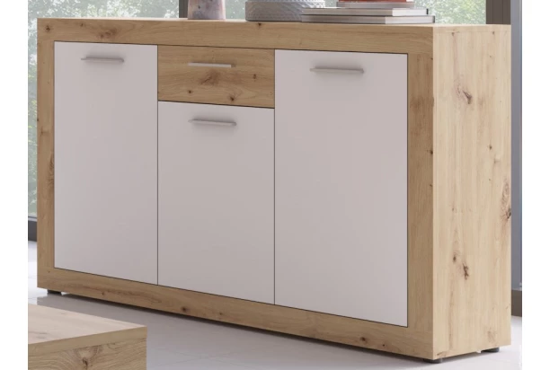 Komoda z kolekce Brilon – nábytek v moderním nadčasovém stylu působí elegantně a zároveň prakticky poslouží během každého dne. Přímočaré linie v kombinaci dekoru dub artisan/bílá navíc zvýrazňuje oblíbená optika širokých předních rámů. Komoda o šířce 135 cm nabízí dostatek úložného prostoru, kam uschováte například oblečení nebo větší předměty. Tato skříňka tak bude praktickou a zároveň estetickou součástí moderního bytu.