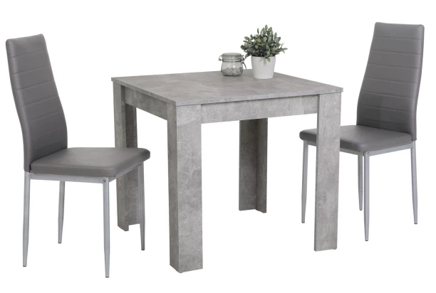 Moderní jídelní set je vhodný i do malého bytu, můžete ho umístit do kuchyně, malé jídelny anebo obýváku. Sada obsahuje čtvercový jídelní stůl v imitaci šedý beton a dvě kovové jídelní židle s praktickým potahem v šedé ekokůži.