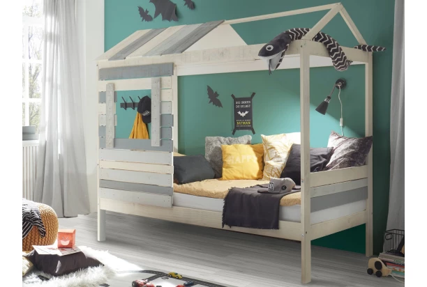 Atraktivní dětská postel ve tvaru domečku potěší každé dítě. Tato postel o velikosti lůžka 90×200 cm má boční posuvnou stěnu s okénkem a poskytne tak přes noc útulné zázemí pro klidný spánek, naopak přes den bude inspirovat k dětským hrám. Na horní stříšku můžete snadno zavěsit hračky, dekorace anebo třeba světelný řetěz pro příjemný večerní efekt. Konstrukce dětské postele z masivního dřeva v šedo-béžovém provedení zajišťuje potřebnou stabilitu.
