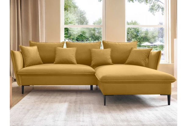 Elegantní rohová sedačka v trendy stylu zajistí příjemné pohodlí v prostoru malého i velkého obýváku. Kvalitně vypolstrované sezení, velké polštáře a relaxační otoman pro váš každodenní komfort. Očalouněna odolnou látkou v barvě hořčicová žlutá. Tato sedací souprava s bočním otomanem vytváří pravý roh a je vybavena rozkládací funkcí pro příležitostné spaní. Součástí je i úložný prostor, kam lze ukládat polštáře, deky nebo cokoliv, co zrovna nepotřebujete. Pod stabilní kovové nohy se dostane i robotický vysavač, který je často pomocníkem dnešních moderních domácností.